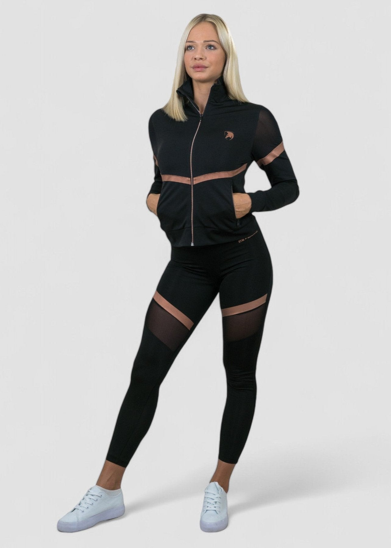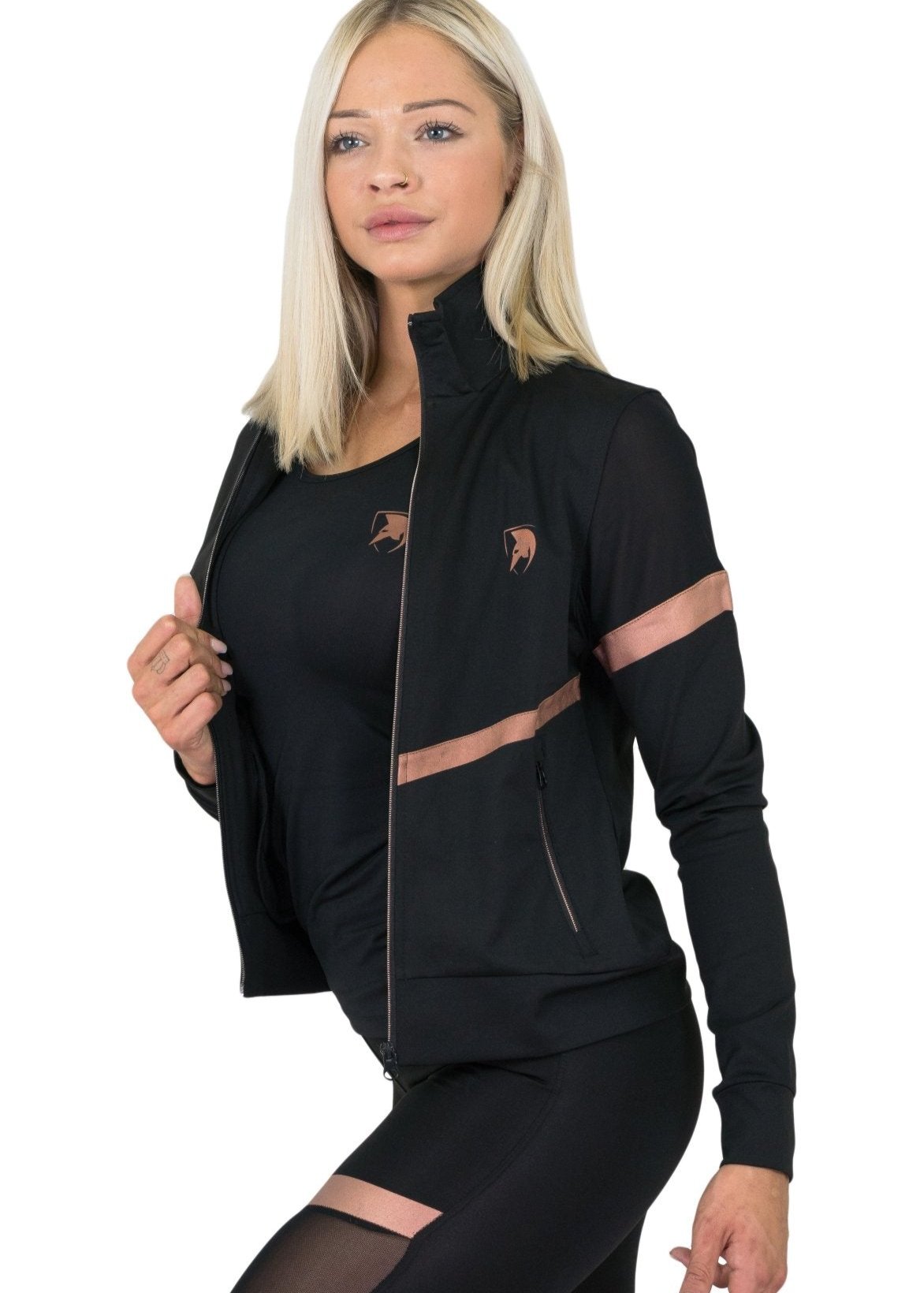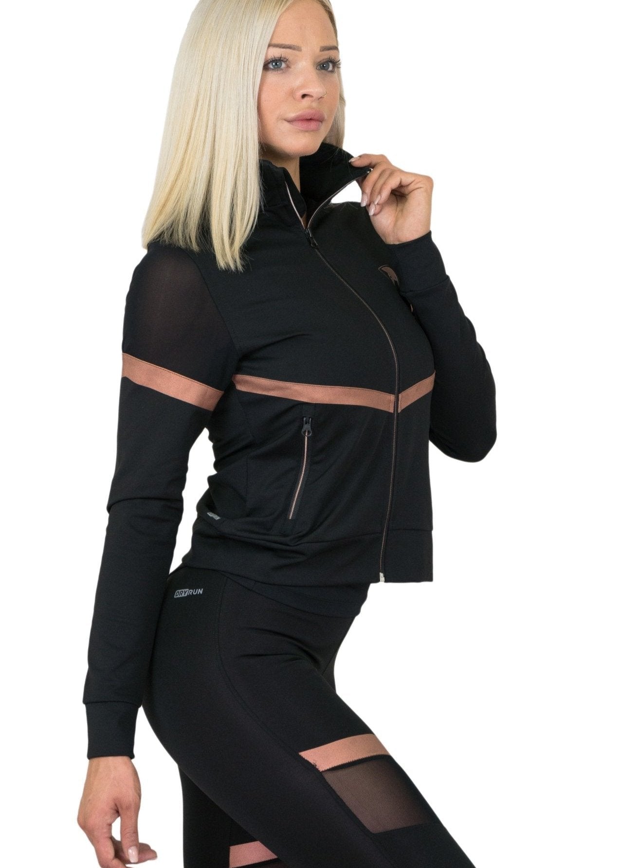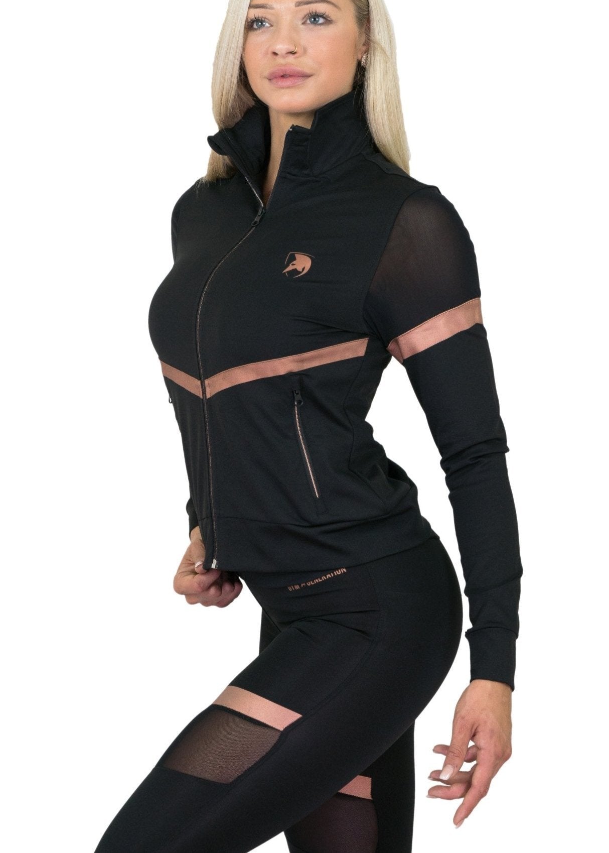 With stylish mesh panels on the sleeves and sides, this women's training jacket enhances breathability while offering a sleek and feminine look. The elegant rose gold accents add a touch of luxury, making this jacket a true standout piece for women who appreciate both functionality and fashion.